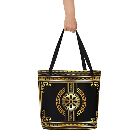 Greek Key Gold Black Flower Tote Bag w/ Pocket