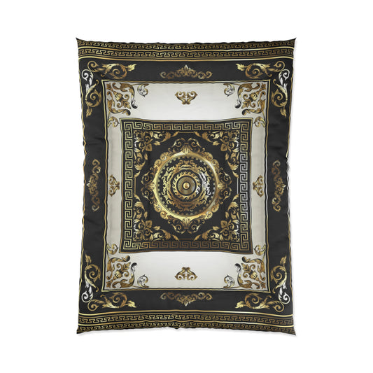Greek Key Ornate Baroque Black Cream Gold Comforter