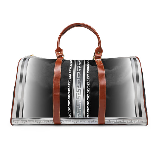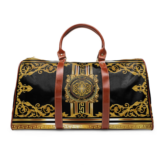 Baroque Ornate Gold Greek Key Black Waterproof Travel Bag