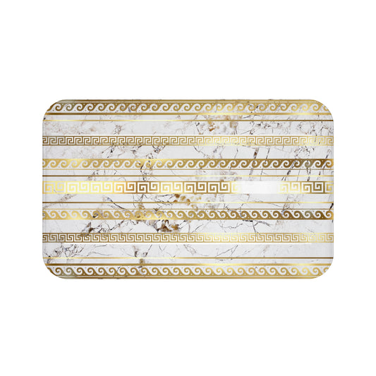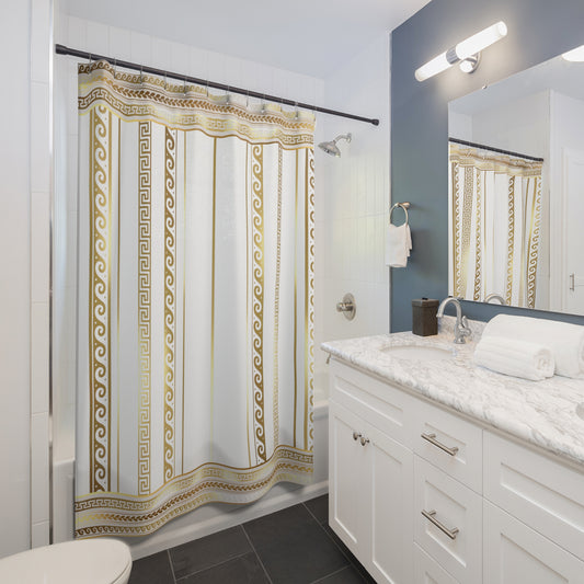 Bathroom decor featuring bathmats, show curtains. Many of the bathmats and shower curtains feature a Greek key designs. Collection includes beach/bath towels and different styles of swimwear.