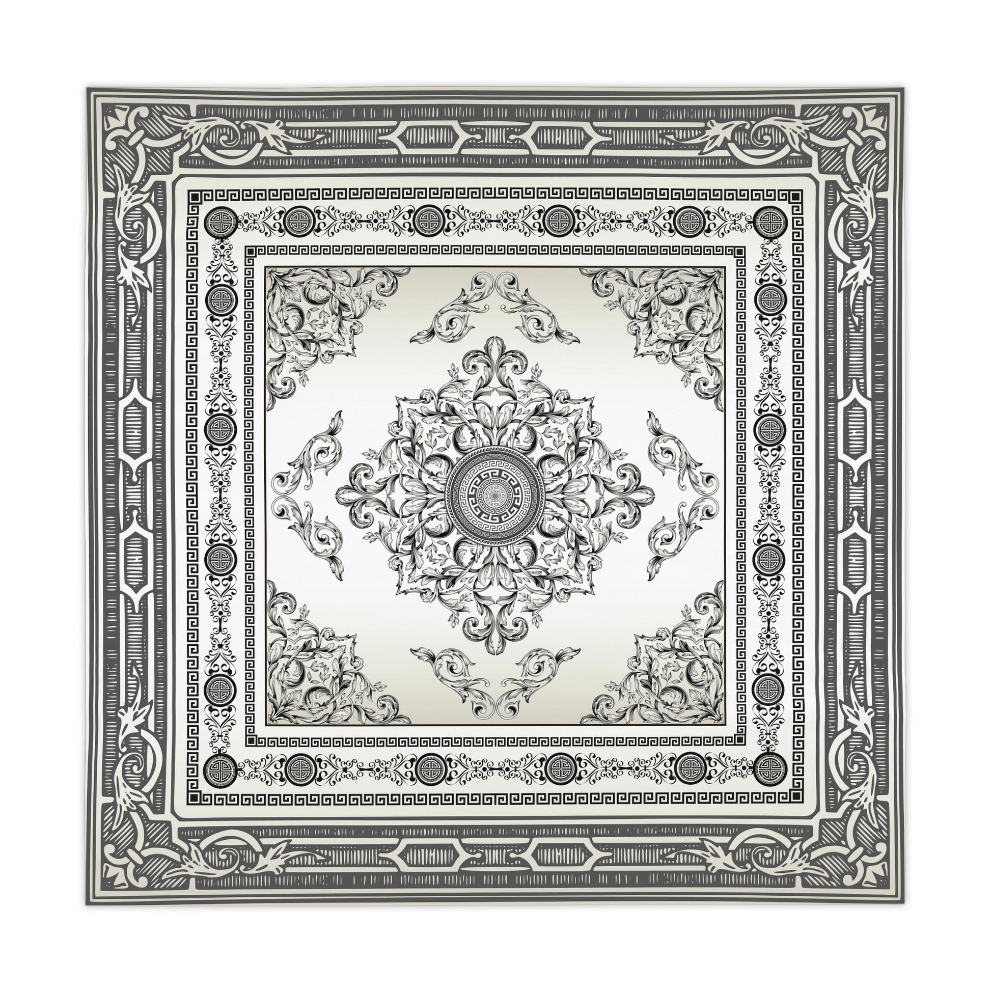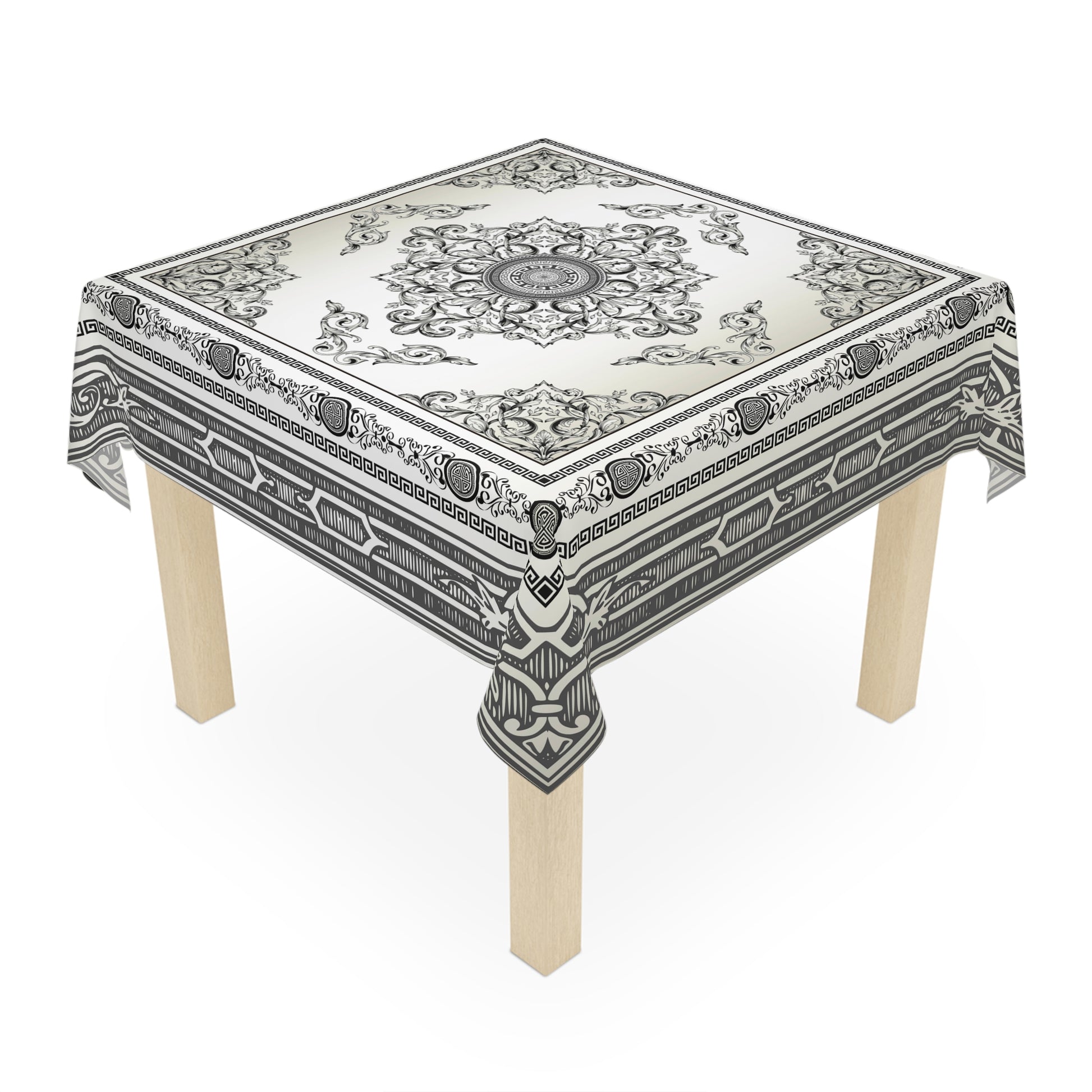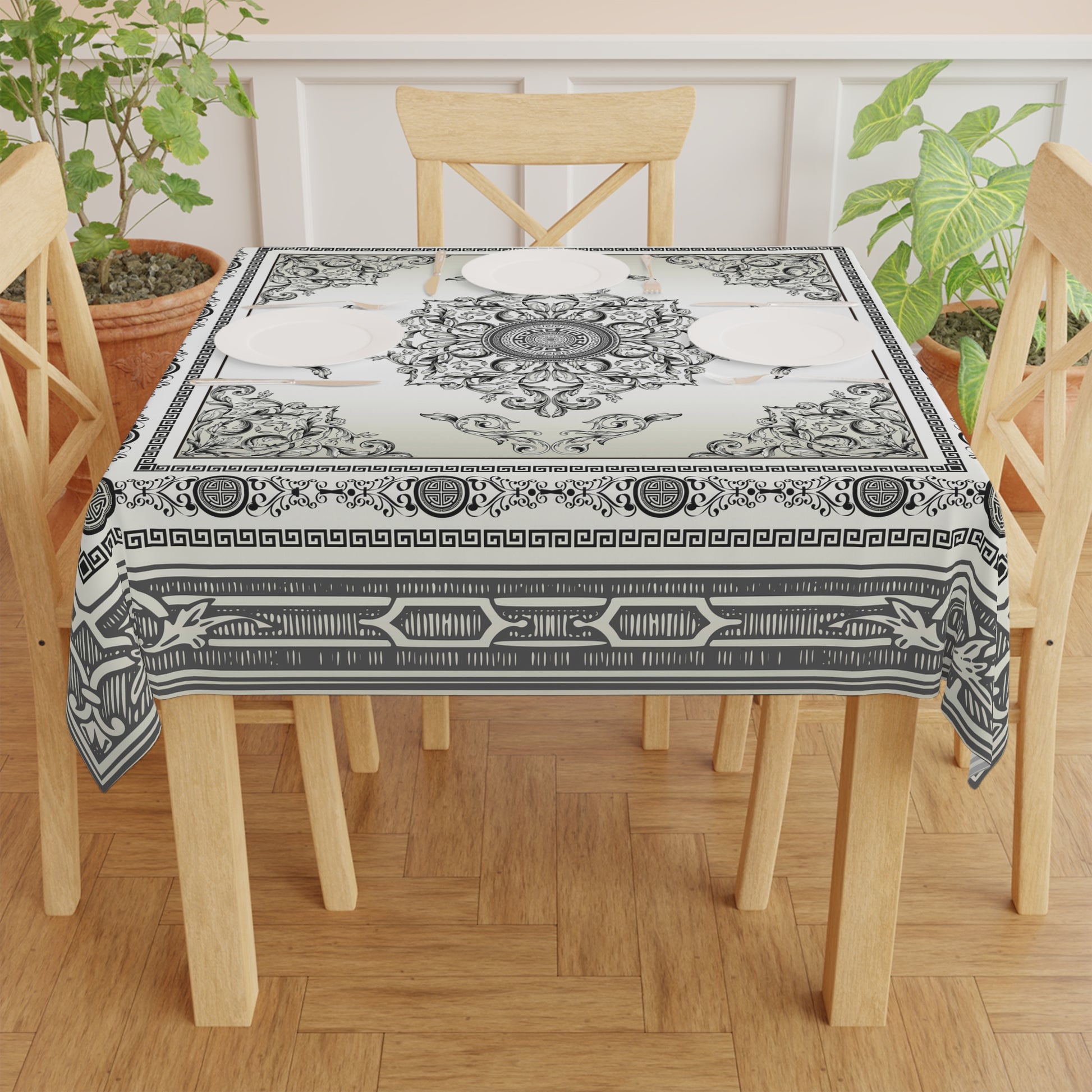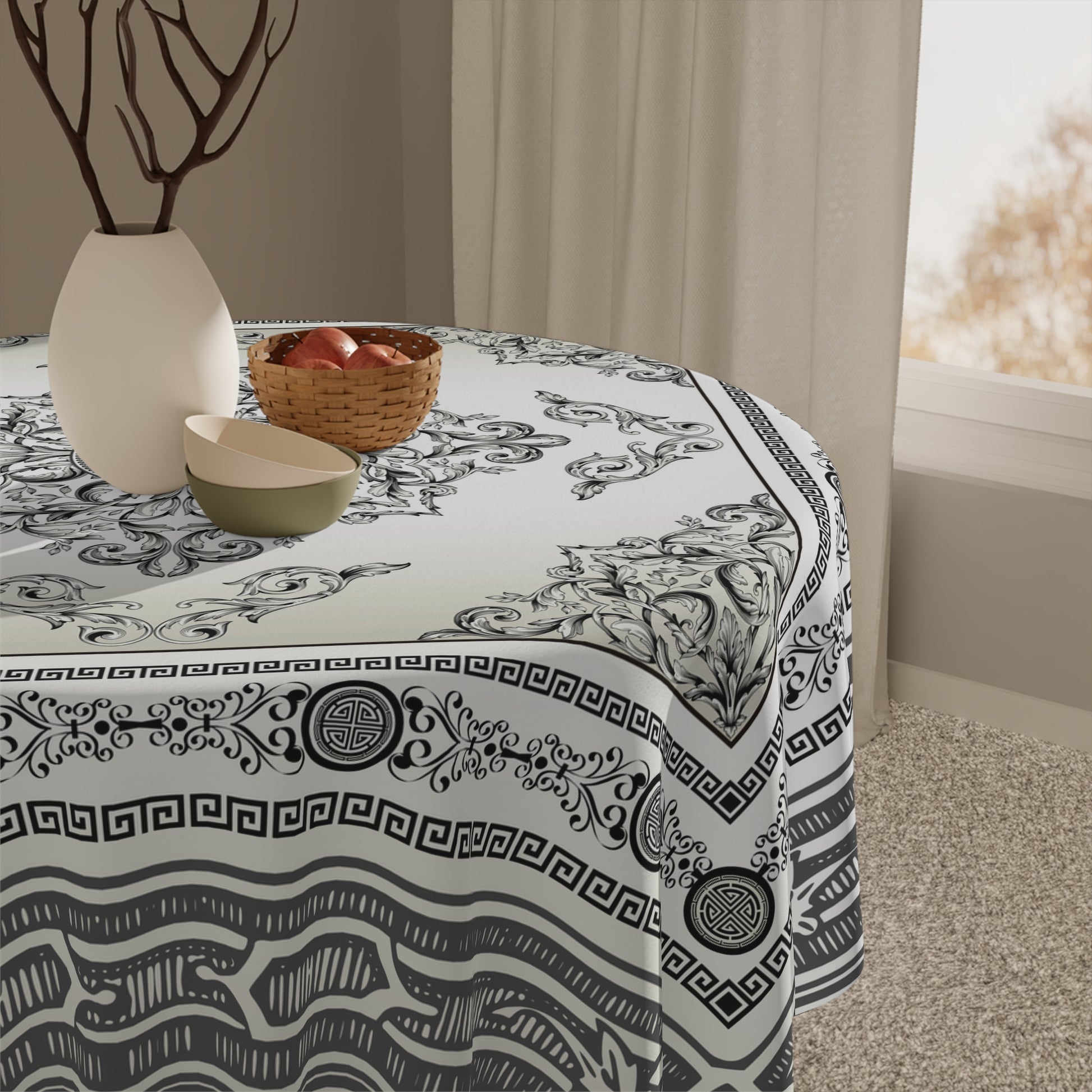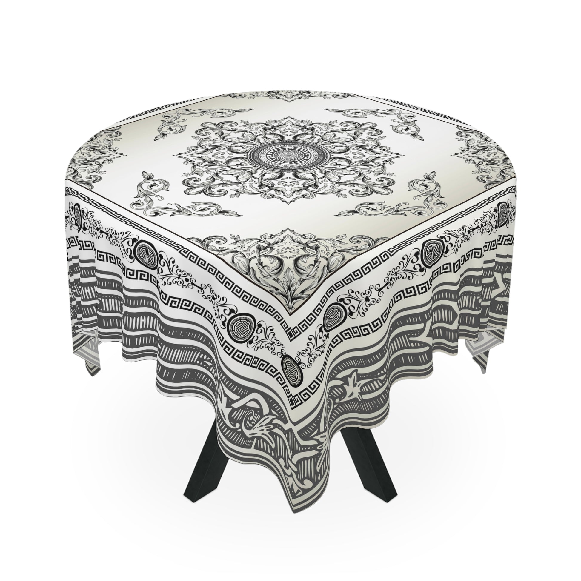Baroque Ornate Black Cream Gray Greek Key Tablecloth