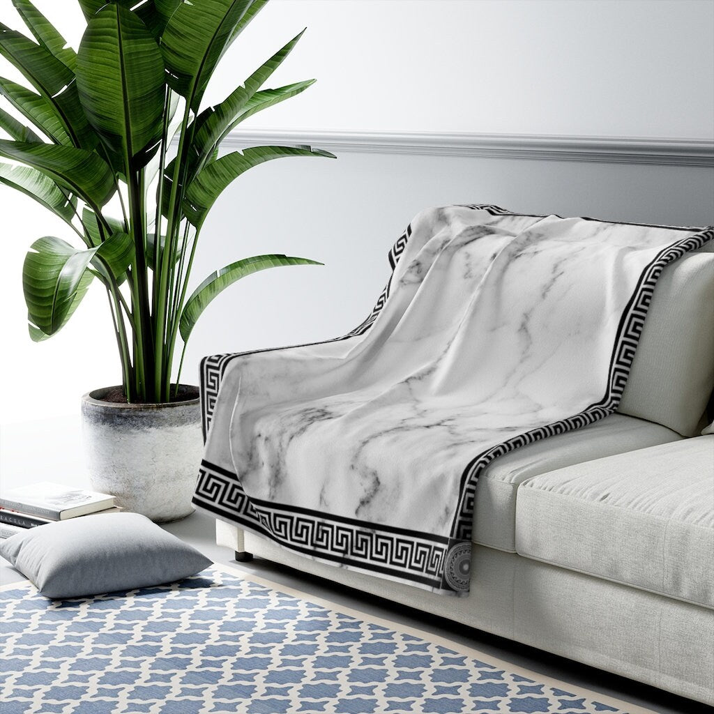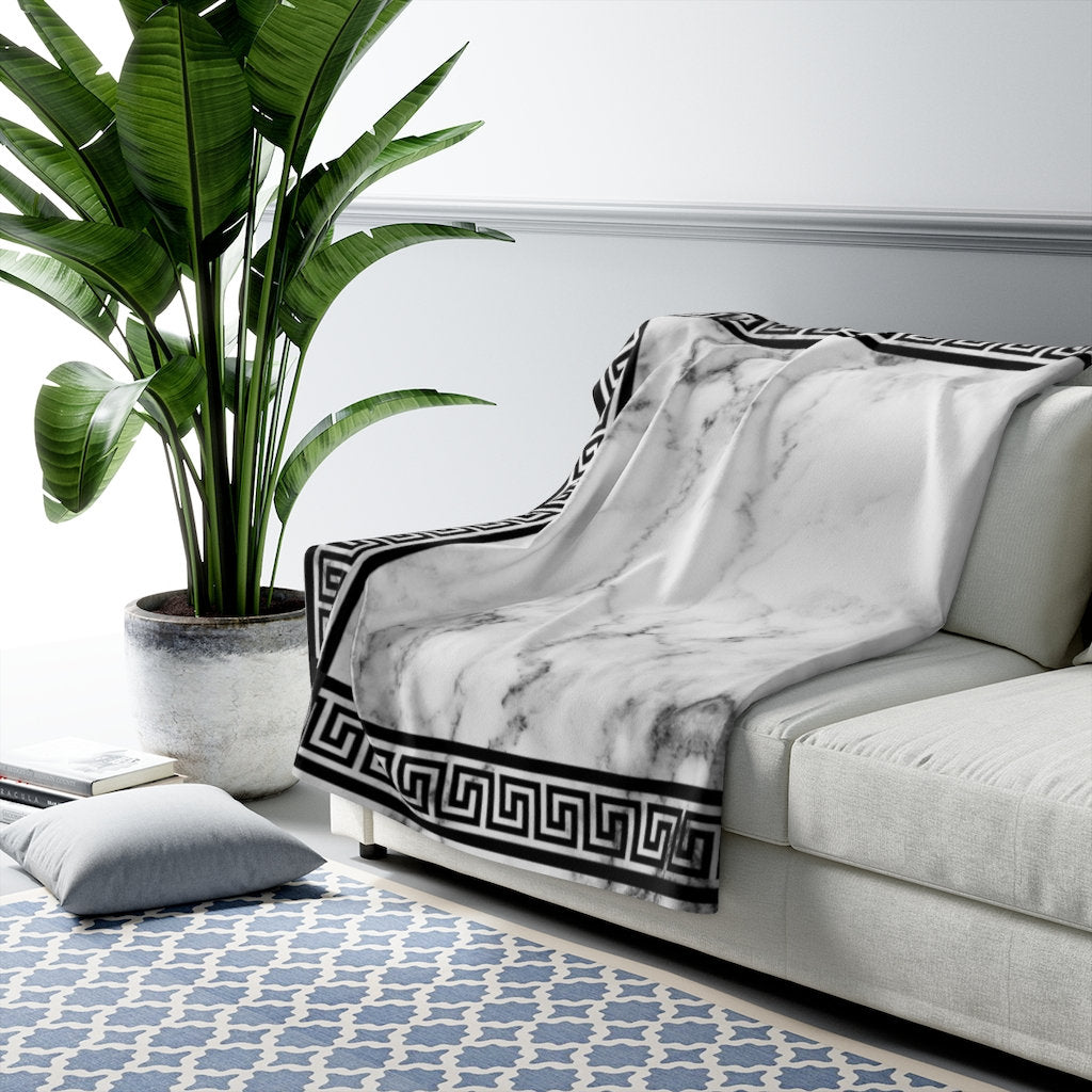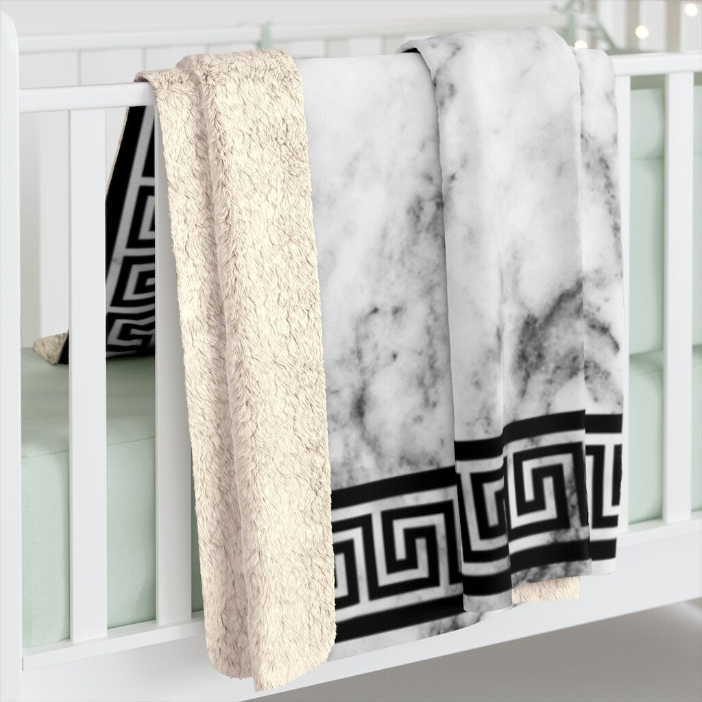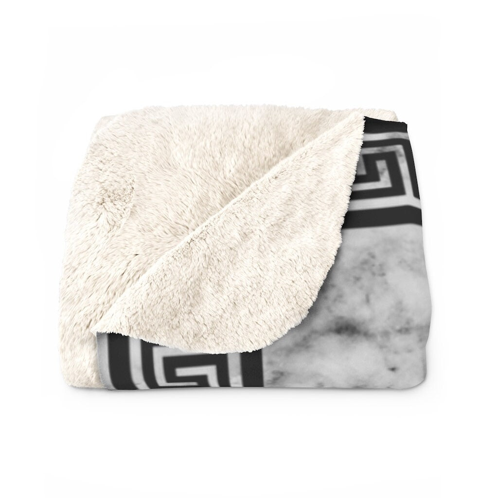 Black Greek Key on White Marble Sherpa Fleece Blanket