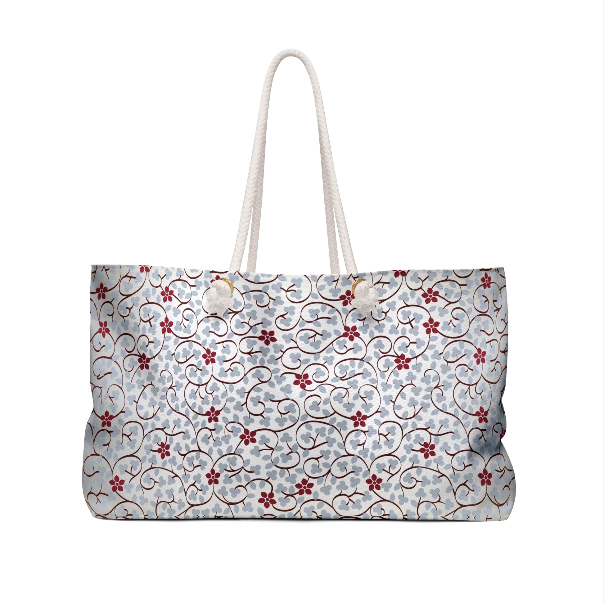 Our oversized Weekender Tote is perfect for your weekend at the beach or in town. The wide-mouthed, durable bag holds a generous amount of personal items and is easily held by its thick rope handles. .: 100% Spun Polyester .: T-bottom .: Cream sheeting interior lining .: One size: 24" x13"