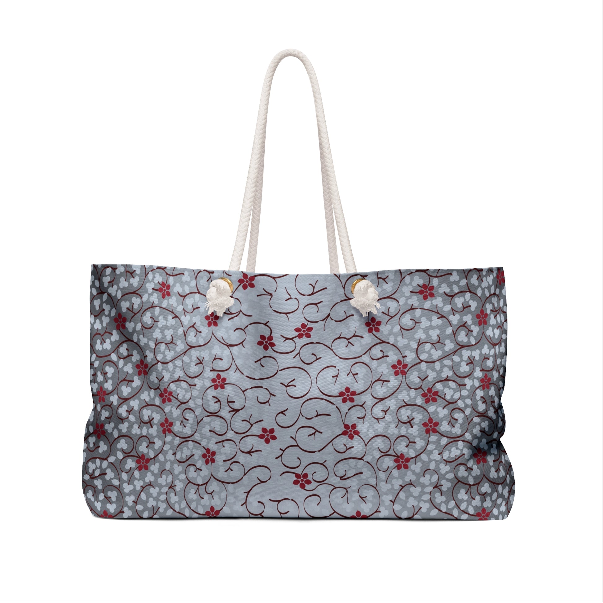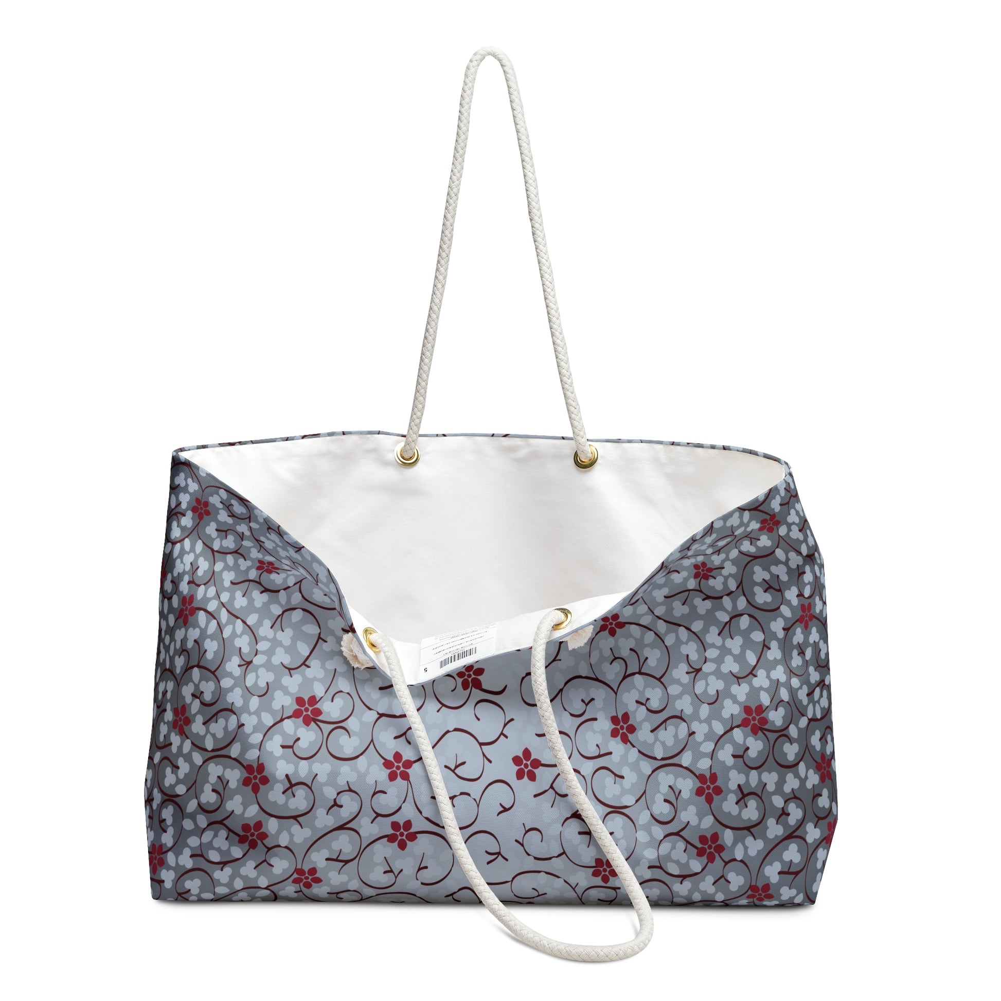 Our oversized Weekender Tote is perfect for your weekend at the beach or in town. The wide-mouthed, durable bag holds a generous amount of personal items and is easily held by its thick rope handles. .: 100% Spun Polyester .: T-bottom .: Cream sheeting interior lining .: One size: 24" x13"