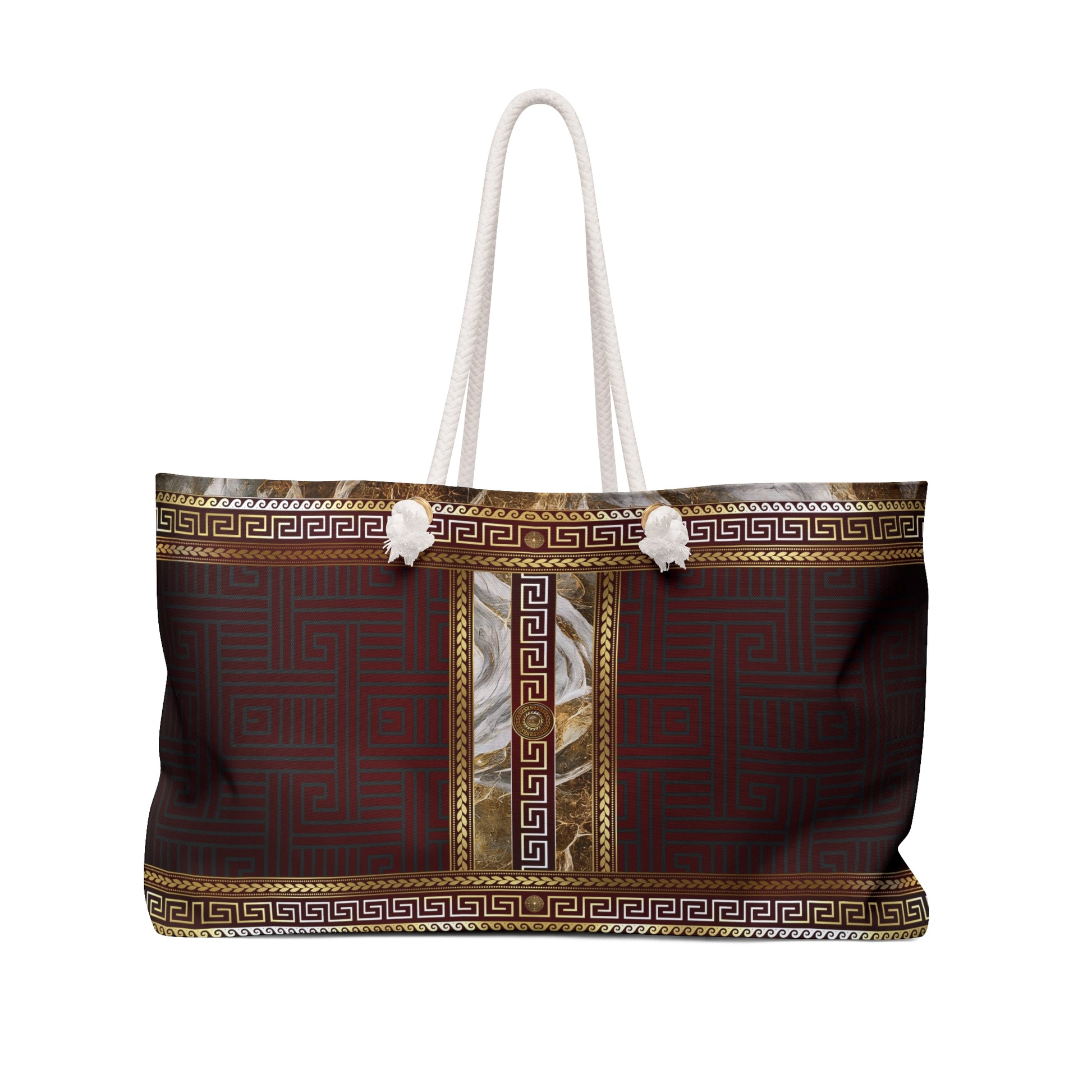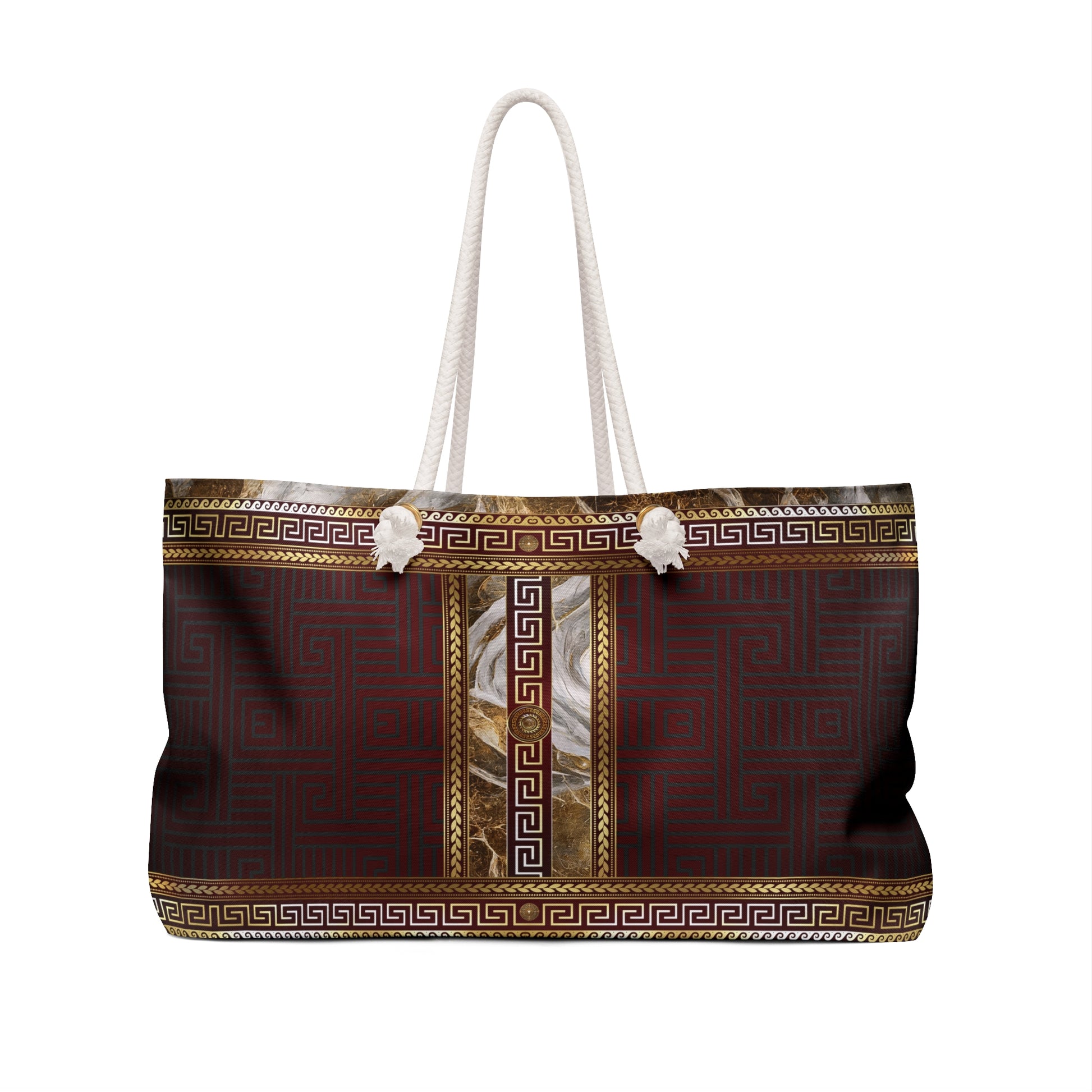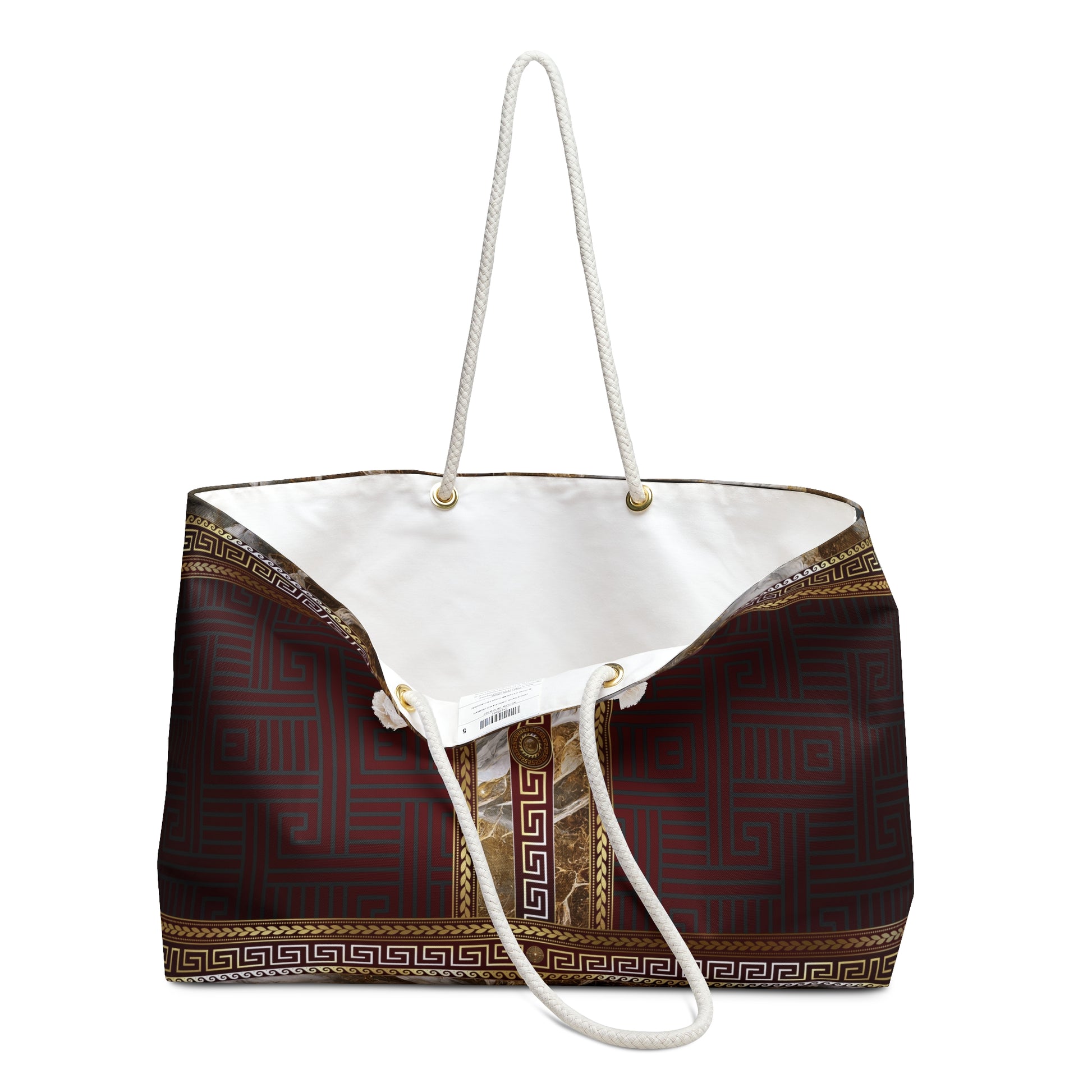 Our oversized Weekender Tote is perfect for your weekend at the beach or in town. The wide-mouthed, durable bag holds a generous amount of personal items and is easily held by its thick rope handles. .: 100% Spun Polyester .: T-bottom .: Cream sheeting interior lining .: One size: 24" x13"