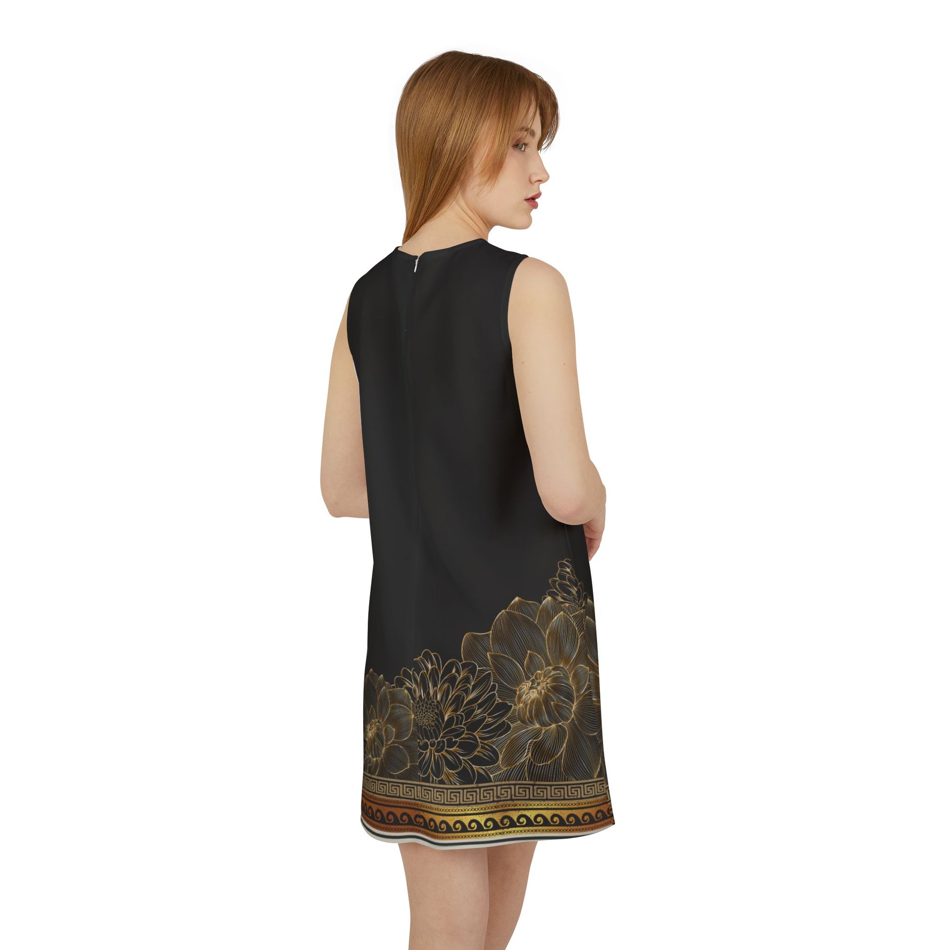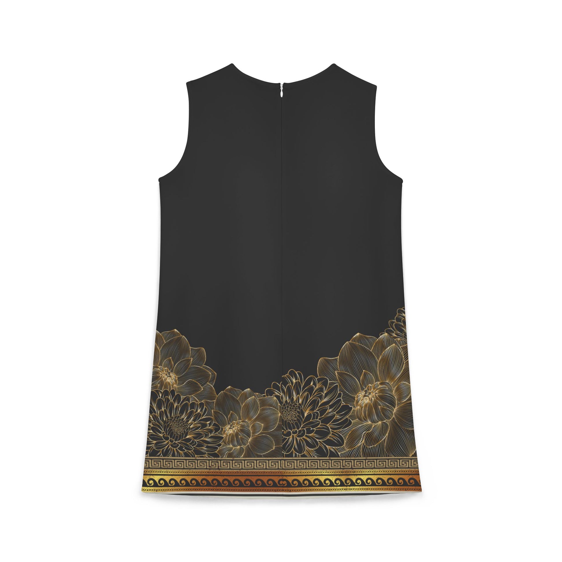 Greek Key Gold Flowers Black A-line Sleeveless Dress