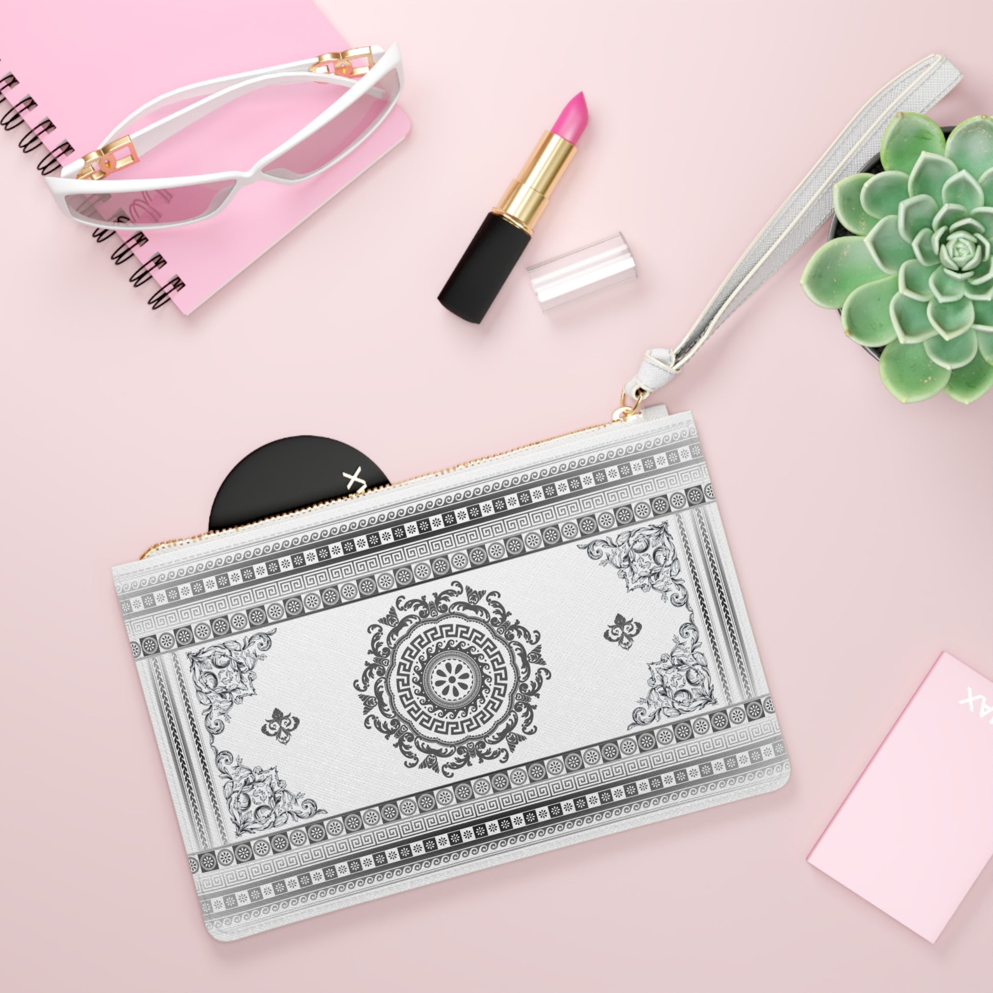 Designed with a loop handle to quickly free your hands, this custom clutch bag is made for the fashionista on the go. It can hold everyday essentials such as a phone, wallet, and keys. It features a zip fastening and a fully lined internal pocket. It is made of vegan leather in the Saffiano pattern finish that was invented by Prada.