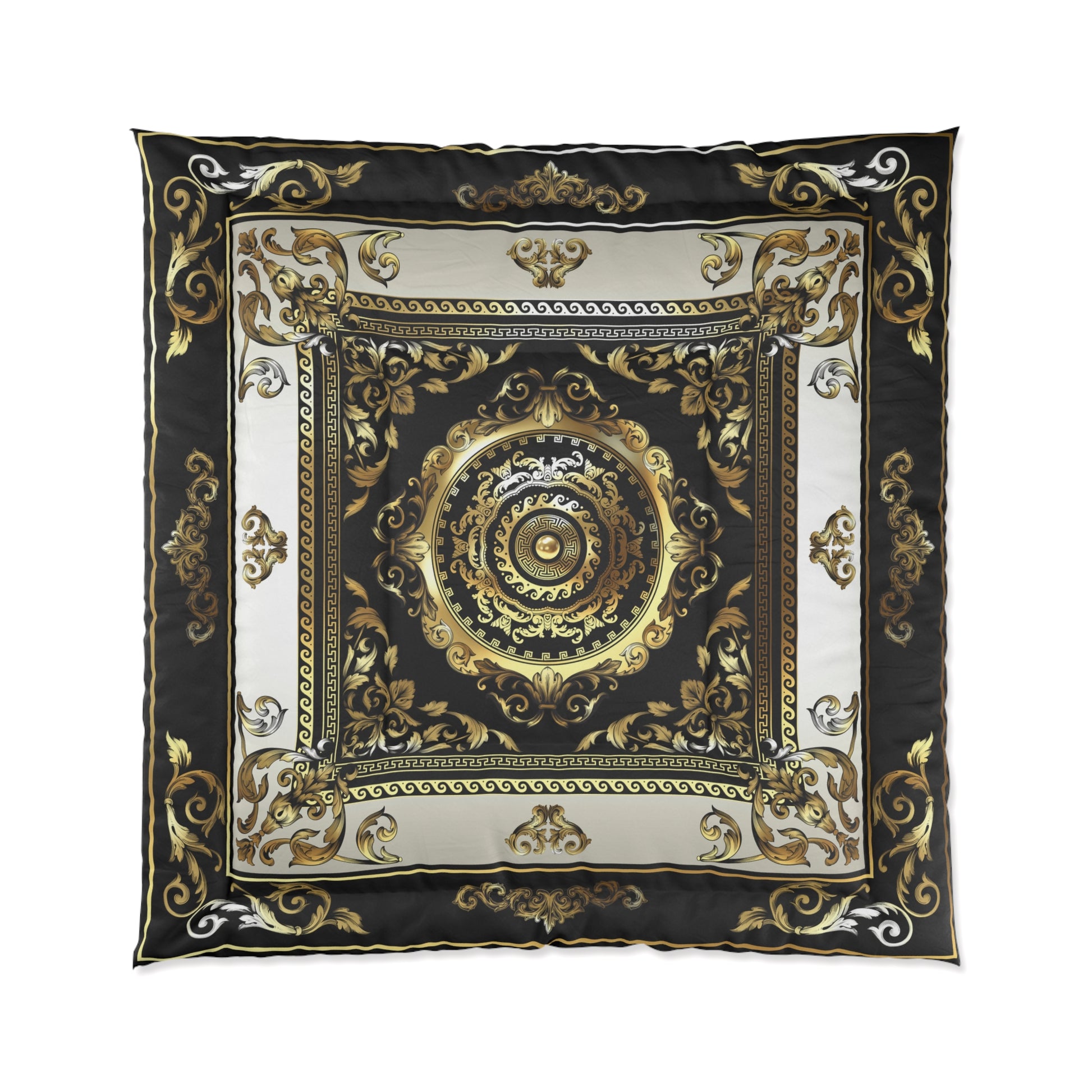 Greek Key Ornate Baroque Black Cream Gold Comforter
