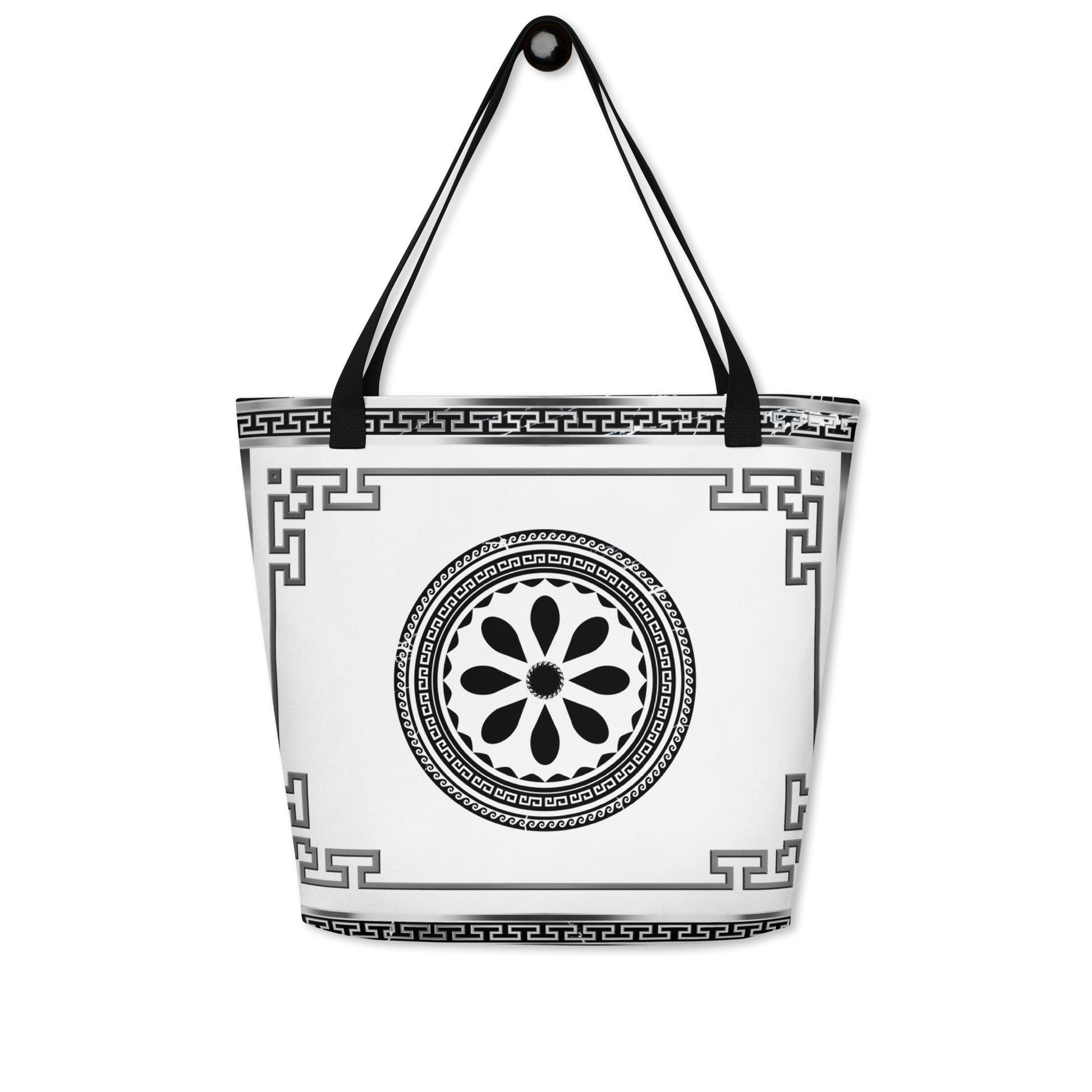 Greek Key Silver White Black Flower Tote Bag w/ Pocket